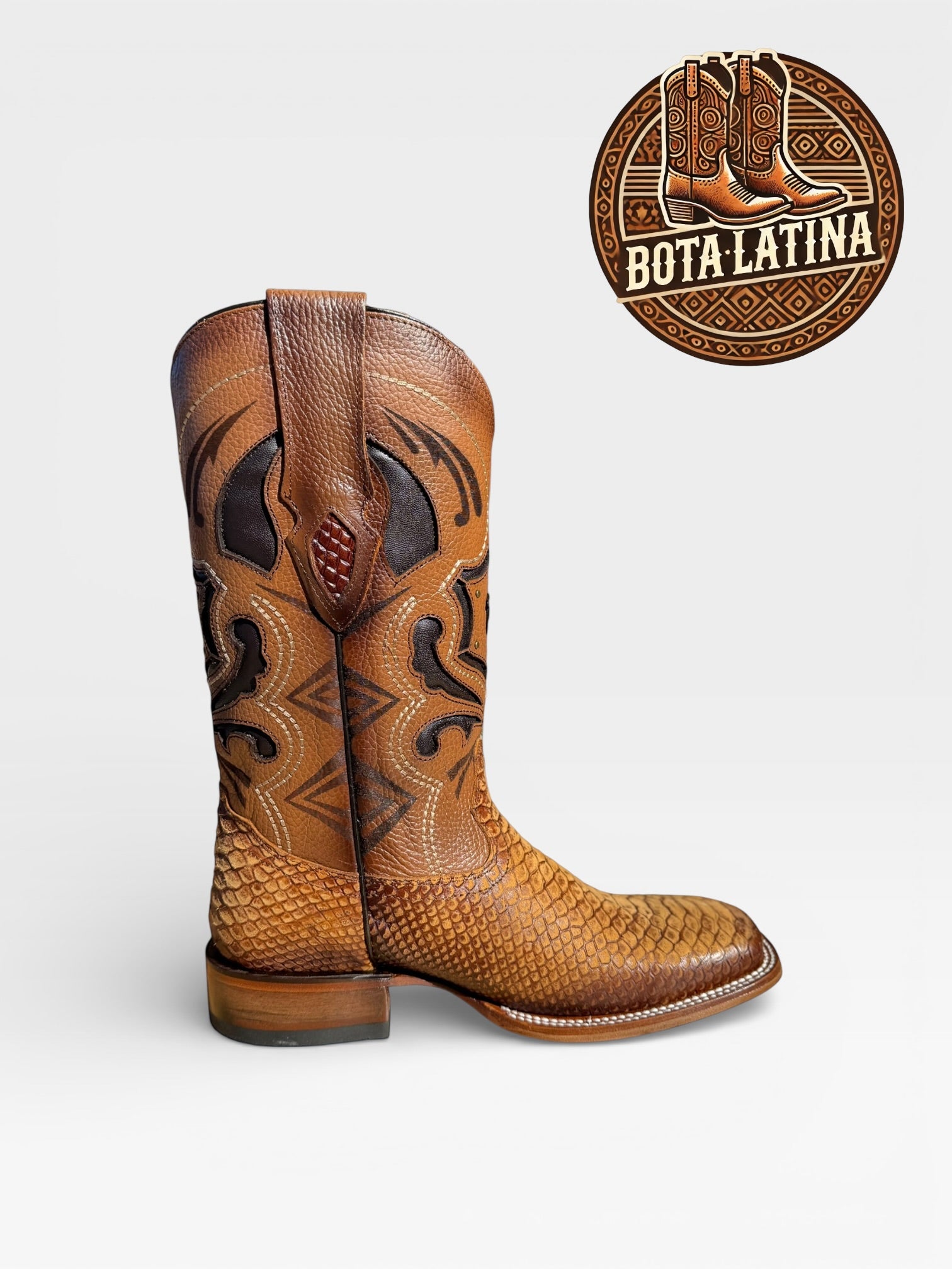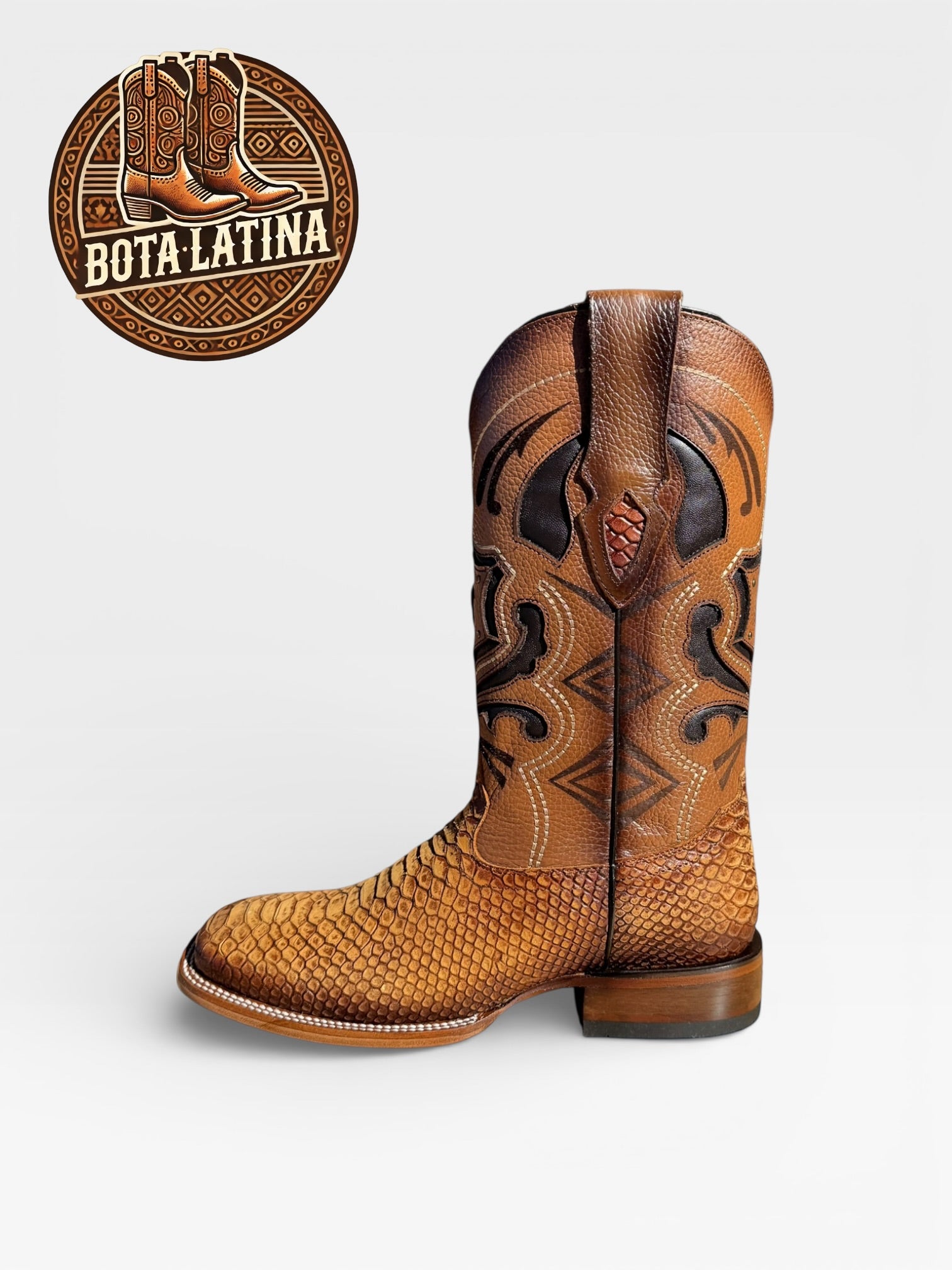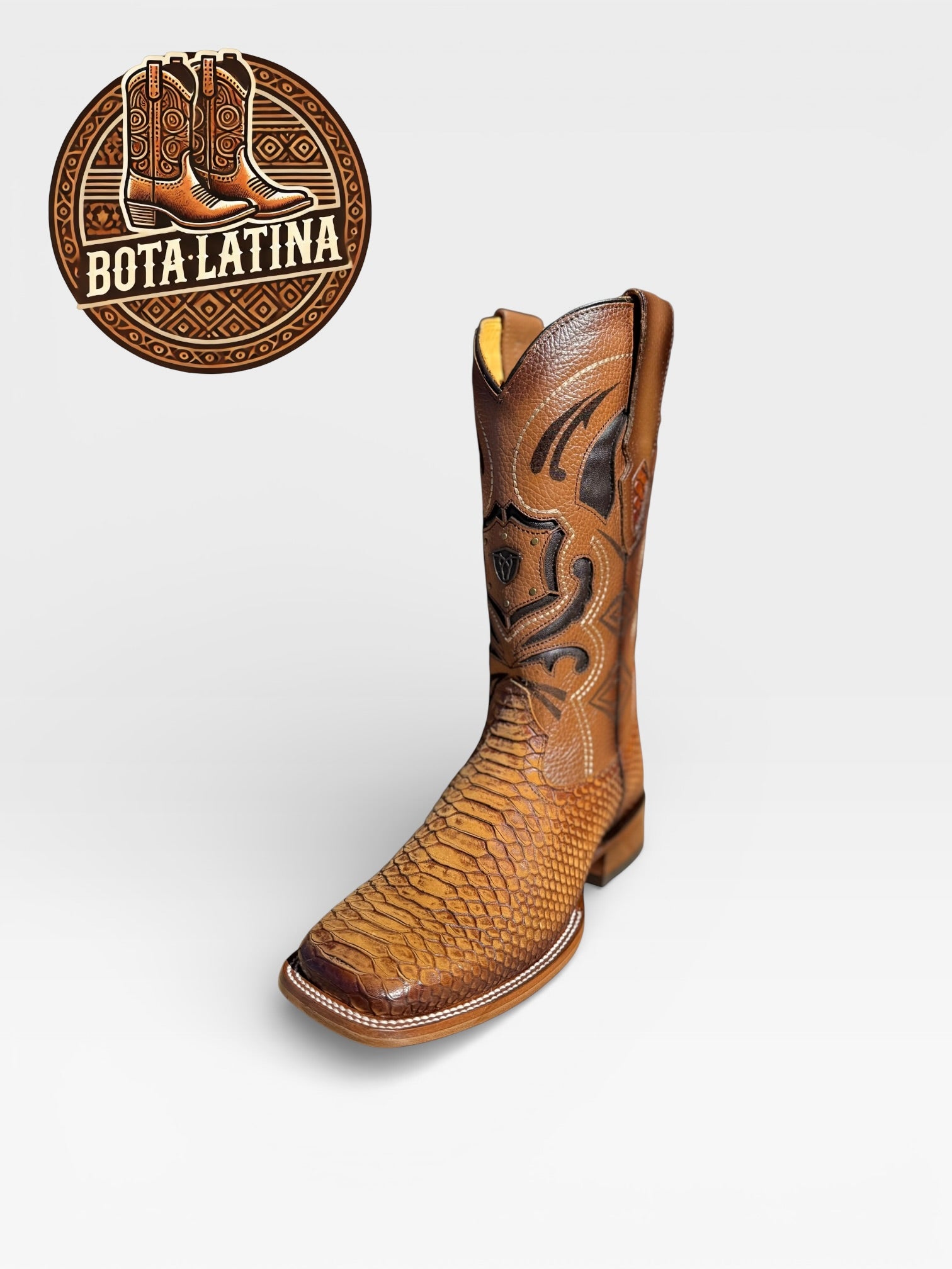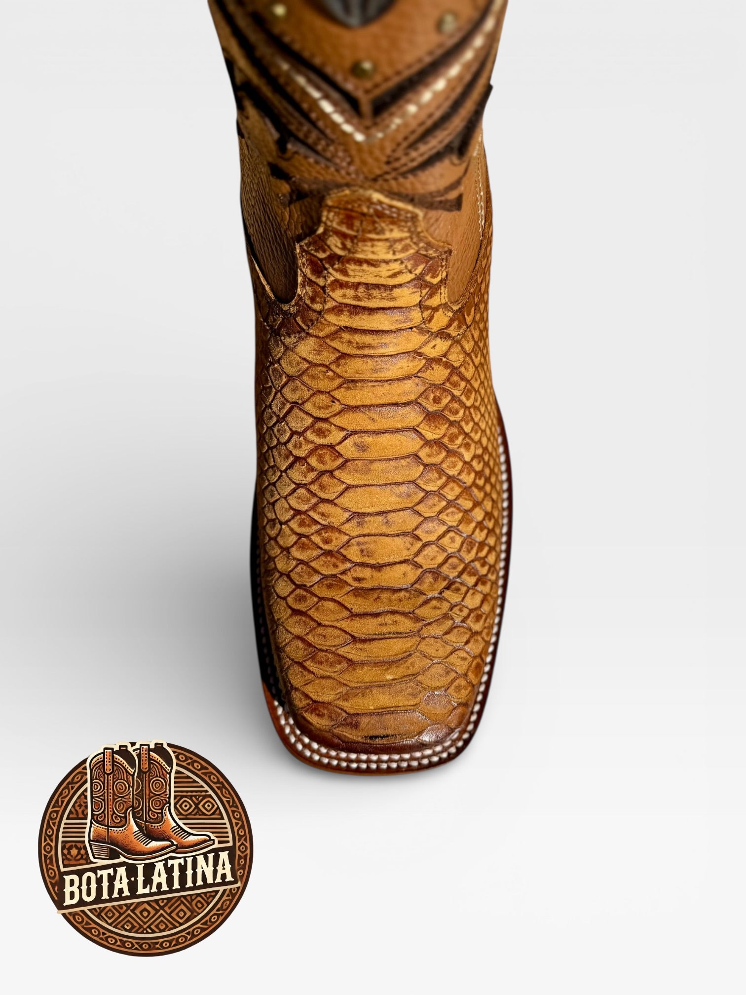 Bota vaquera premium Piton Miel elaborada en piel exótica Pitón en color miel, con acabado artesanal y textura natural que resalta desde lejos. Diseñada para eventos, jaripeos y uso diario con presencia fuerte, calce cómodo y construcción resistente. Un estilo exótico clásico que combina lujo y tradición vaquera.
